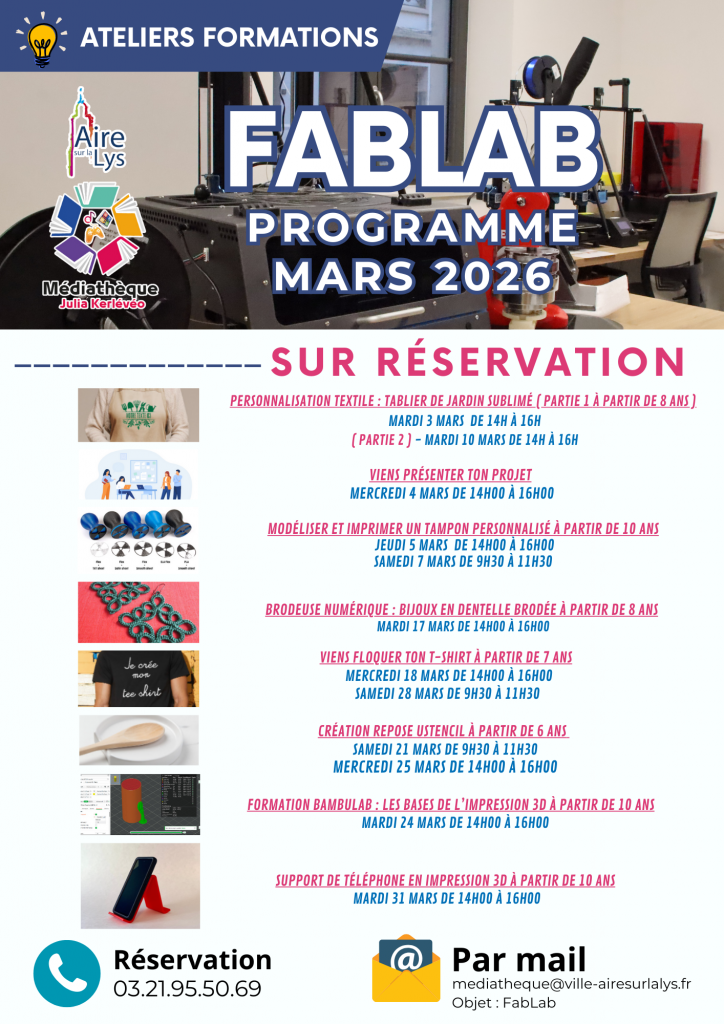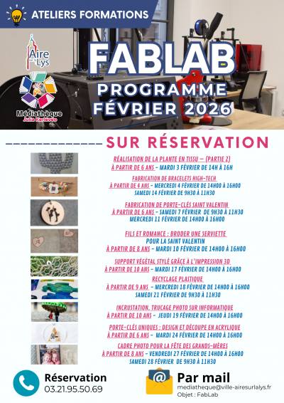 Le Fablab vous propose de vous former à différentes techniques lors de plusieurs ateliers gratuits programmés tous les mois. Inscrivez vous par mail : mediatheque@ville-airesurlalys.fr (en mettant en objet « Fablab » ou par téléphone au 03.21.95.50.69